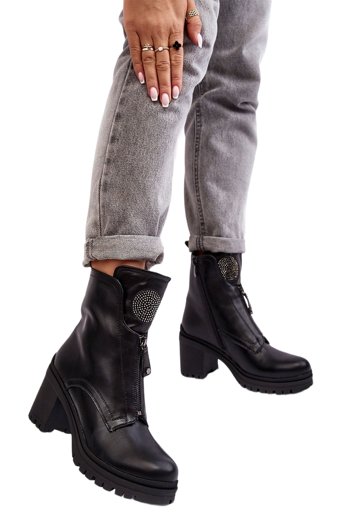 Women's boots are set on a heel in the form of a post and a platform. This model was made of eco leather. Fastened on the side with a zipper. In addition, they have a stiffened heel counter and a decorative zipper on the front. The tongue was decorated with rhinestones. The center of the boots is insulated with a shoe blanket.