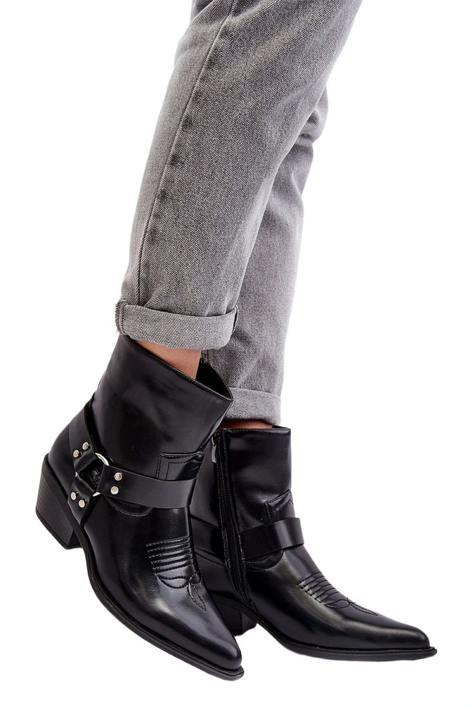 Cowboy style boots are stylish and practical footwear that can be used in a variety of styles! Made of eco leather. Set on a low heel. Pointed nose will optically slenderize the legs. The upper is decorated with stitching and connected straps. The inside is insulated with a shoe blanket. A must have!