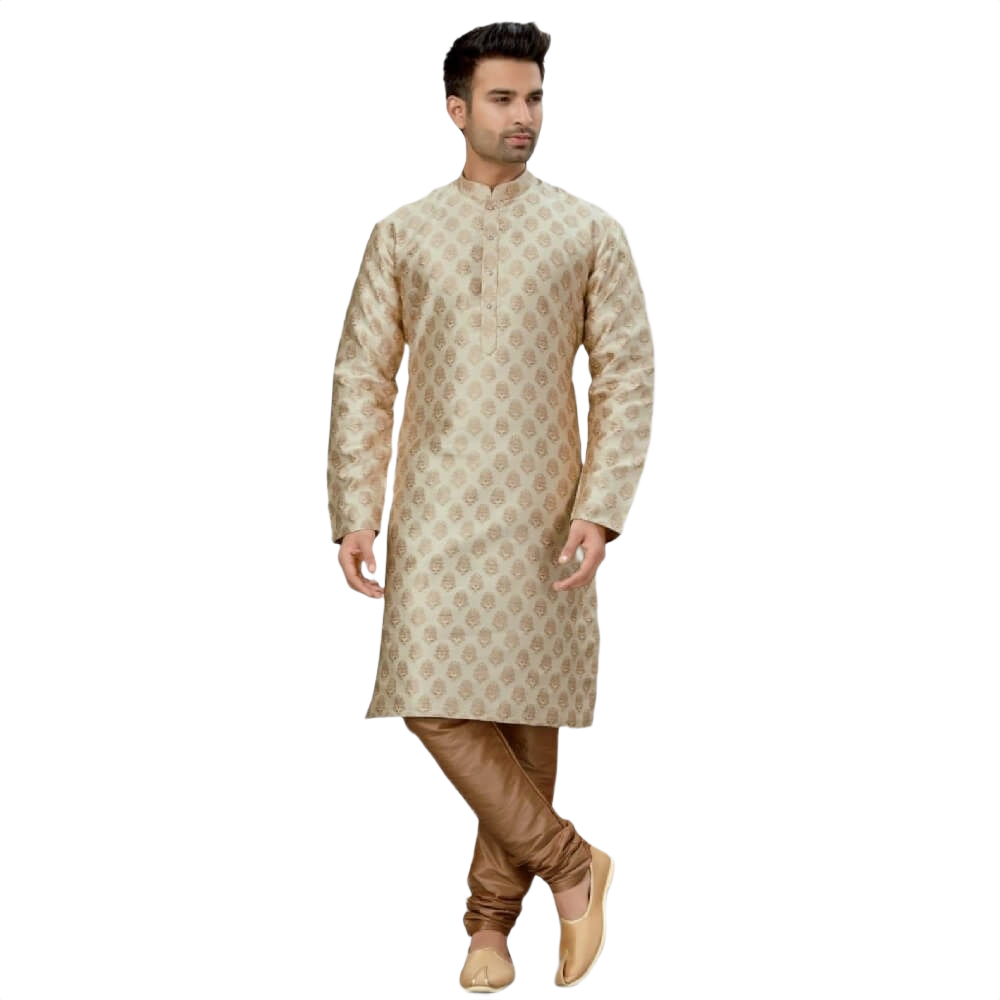 Looking for an elegant and festive outfit that will make you stand out at any event? Then don't miss our Brocade Silk Kurta Pajama Set in Cream! This gorgeous set features a beautiful brocade kurta with golden pajama pants. It's perfect for weddings, festivals, or any other special occasion. The rich cream color is perfect for any skin tone, and the intricate brocade details are sure to turn heads. So don't wait - order your Brocade Silk Kurta Pajama Set today!
