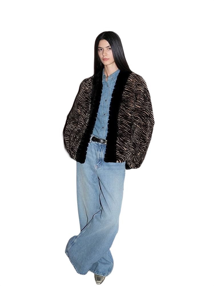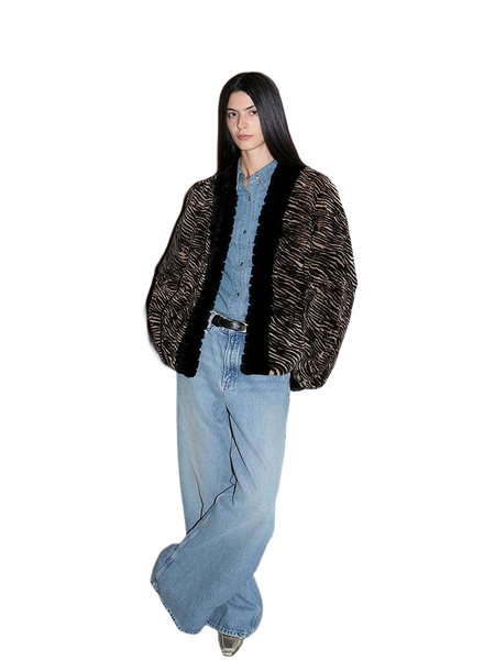 Irregular pattern printing with eco-friendly dyes creates a distorted texture design, breaking the norm. The artistic and aesthetically pleasing pattern is scattered in an orderly manner, and the collision between the silky and delicate Rex rabbit fur and animal print restores the natural and primitive charm of fur.