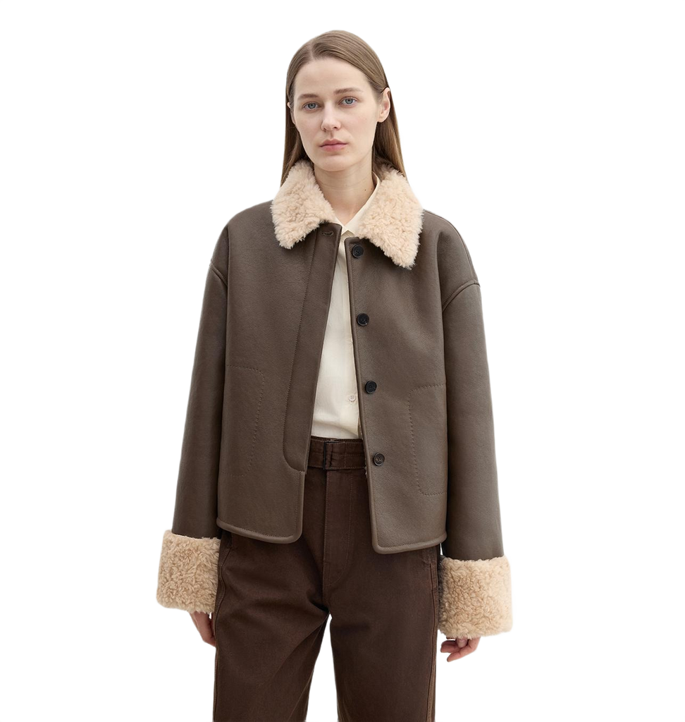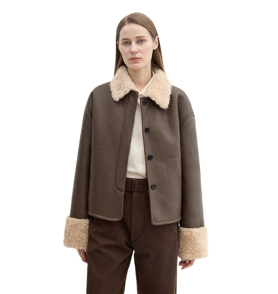 The delicate and thick sheepskin lining is dense and warm, and the genuine artificial compound leather-like PU leather surface presents a high-end luster. The loose straight fit makes you slim and slim, and the neat short style easily optimizes proportions. Comfortable and versatile, it looks tall and stylish. The contrasting wool lapels are warm and the wide raw edge stitching on the cuffs adds a sense of layering and echoes the details.